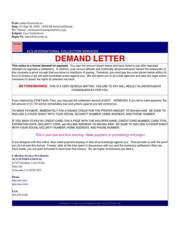After reading the email, I checked a couple of mailing lists. That's when I learned that I wasn't the only one to receive this email; others (with suespammers.org email addresses) had as well. It's my belief that someone on the spammers list reported them to their ISP for the earlier email(s). The ISP contacted the spammer/ACS International, and that upset the spammer in some way. As a way of retaliating, the spammer sent this extortion email to everyone on his mailing list. There is a possibility that this spammer has no connection to ACS International. ACS International may be the victim of a Joe-Job*. It seems to me that it's more likely that ACS International paid a spammer to advertise their debt collection services, and now that spammer has taken it upon himself to retaliate against the individual(s) responsible for reporting him to his ISP.