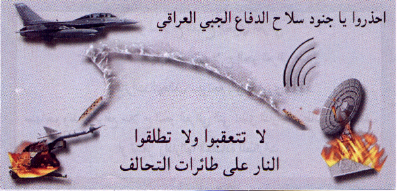 Back of leaflet: (English translation) Attention Iraqi Air Defense. Any hostile action by Iraqi air defenses toward coalition aircraft will be answered by immediate retaliation. Iraqi air defense positions which fire on coalition aircraft or activate air defense radar will be attacked and destroyed.