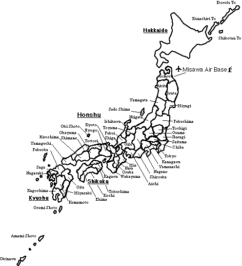 My wife and I lived and worked at Misawa Air Base for three years. I received my assignment to Misawa Air Base Japan in July of 97', departed my prveious duty station (NSGA Sugar Grove, West Virginia) in March of 98', and arrived at Misawa AB Japan, on the 31st of March 1998. Misawa AB is located just outside of Misawa city, in Northern Japan on the western shore of the Aomori prefecture. A Map might help.