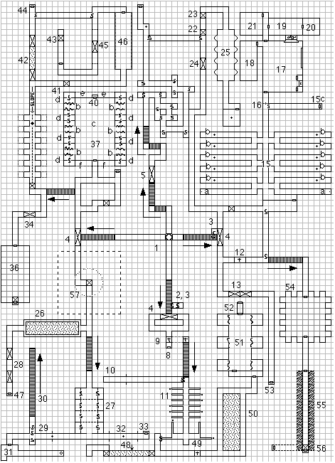 Notes: Small "s" indicates secret door. Small "t" indicates visible trap door. "X" areas indicate open pits or concealed pits/traps. Be sure to read text so that you do not reveal the location of a hidden/secret pit/trap. Dotted areas are spike covered. Numbered areas are covered in the text. Lettered areas are covered in the appropriate numbered areas of the text. Dots or target symbols indicate areas of interest or trigger points of certain traps.